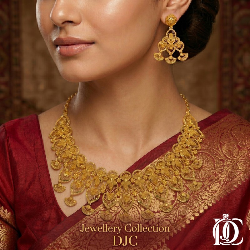 🟡 প্রিমিয়াম ফিলিগ্রি লিফ প্যাটার্ন গোল্ড নেকলেস সেট